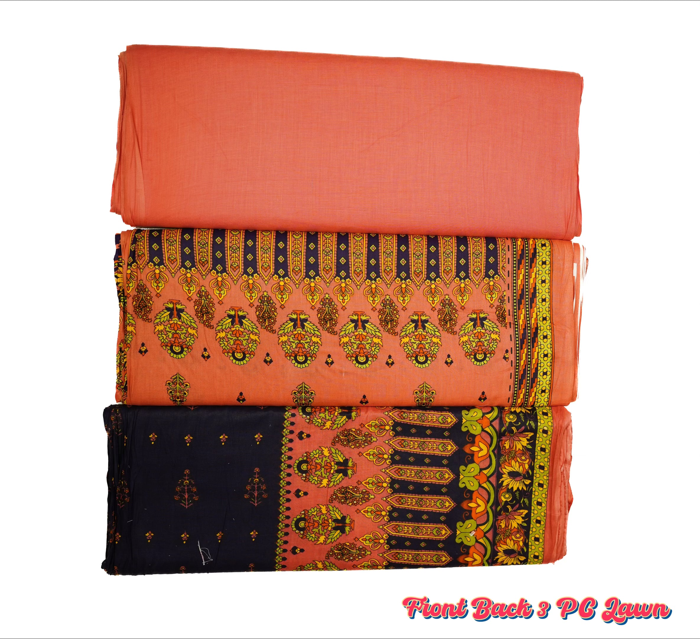 Stylish 3-piece suit featuring a beautifully printed dupatta (2.5 meters), a front-and-back printed designer shirt with sleeves included (3 meters), and a plain color-matched trouser (2.5 meters). Made from premium fabric for a chic and elegant look.