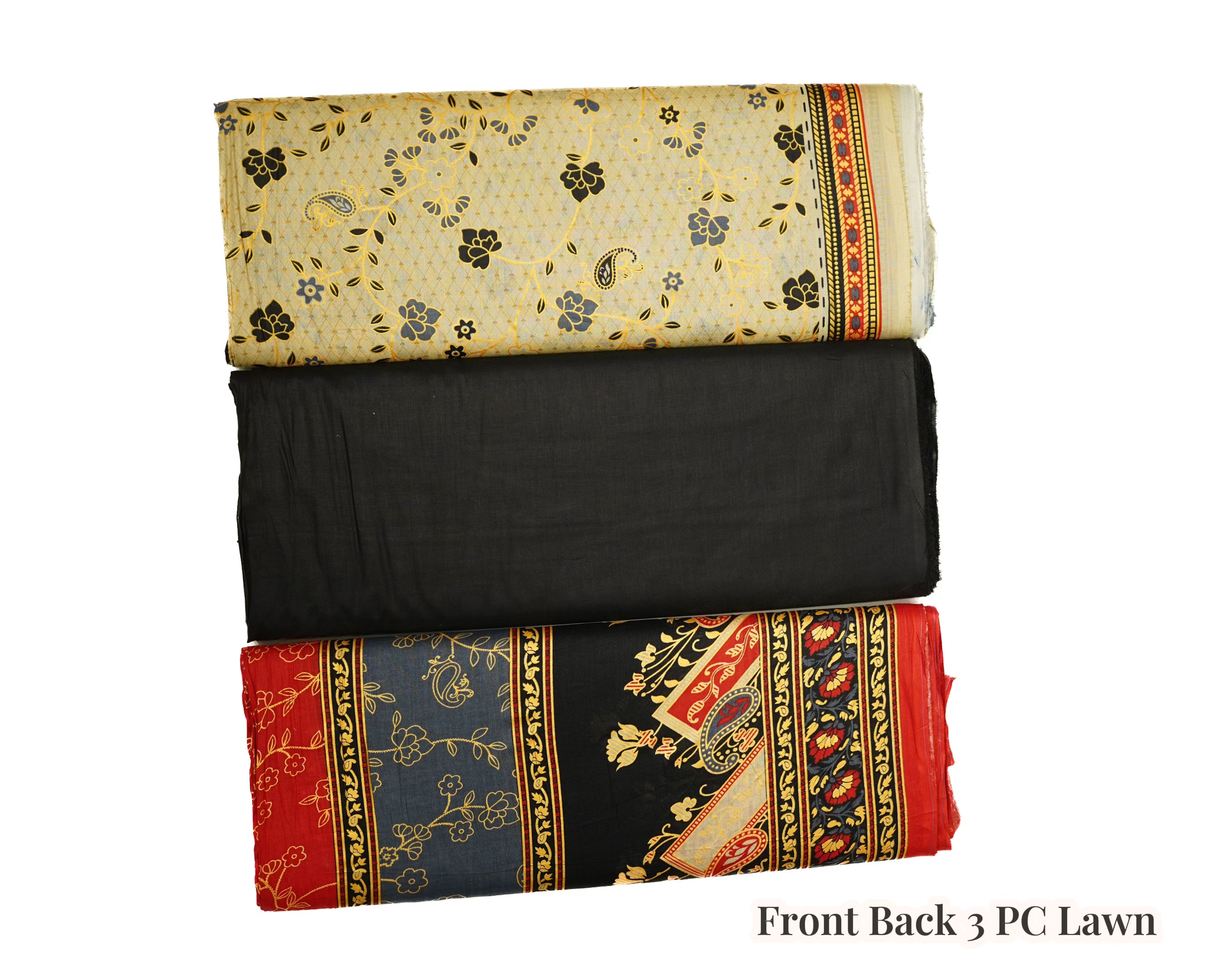 Stylish 3-piece suit featuring a beautifully printed dupatta (2.5 meters), a front-and-back printed designer shirt with sleeves included (3 meters), and a plain color-matched trouser (2.5 meters). Made from premium fabric for a chic and elegant look.